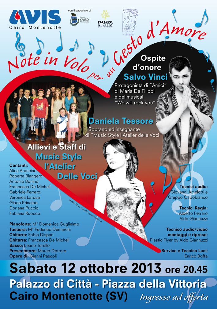 Si terrà nel Teatro Città di Cairo Montenotte sabato 12 ottobre alle 20.45 il concerto "Note in volo per un gesto d'amore" con Daniela Tessore, soprano e insegnante di "Music Style l'Atelier delle voci", gli allievi e lo staff della scuola, e con ospite d'onore Salvo Vinci protagonista del musical "We Will Rock You". L'ingresso è ad offerta per l'associazione dei donatori di sangue
