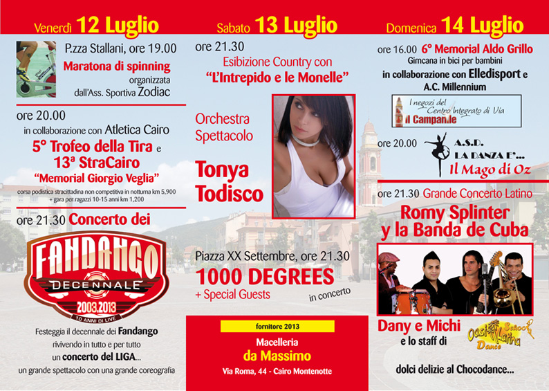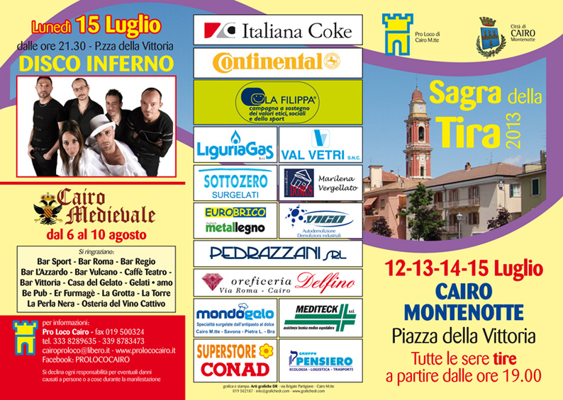 Dal 12 al 15 luglio l'imperdibile appuntamento con il gusto, il divertimento, la buona musica a Cairo Montenotte, venerdì 12 si svolgerà la tradizionale corsa podistica StraCairo "Memorial Giorgio Veglia" quest'anno giunta alla tredicesima edizione - 5° ed. Trofeo della Tira e domenica 14 la gimcana in bici per bambini - 6° "Memorial Aldo Grillo"
