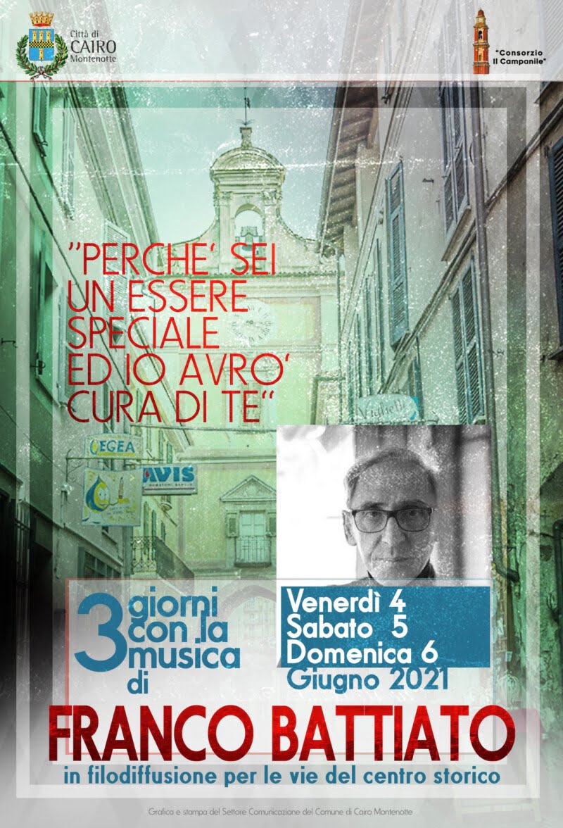 Nei giorni di venerdì 4, sabato 5 e domenica 6 giugno 2021 l’Amministrazione comunale, in collaborazione con il CIV “Il Campanile”, propone, nelle vie del centro storico, tre giorni di musica con le canzoni di Franco Battiato, trasmesse in filodiffusione.