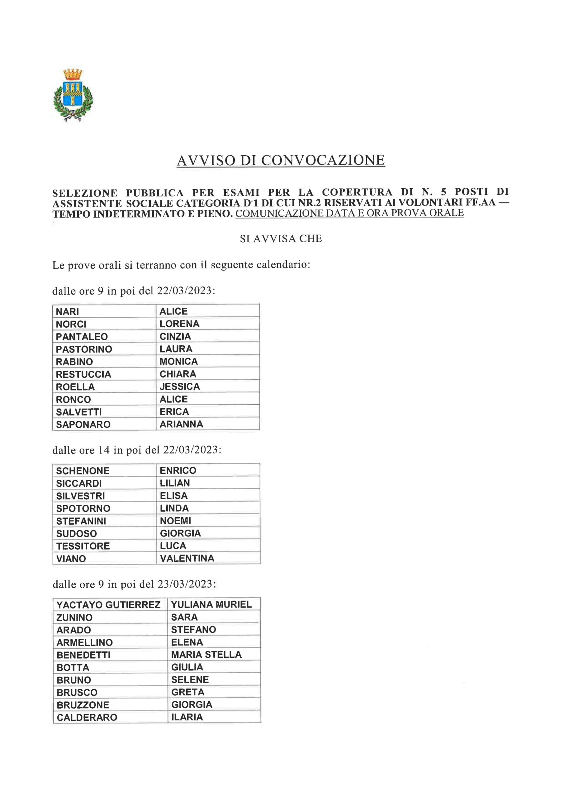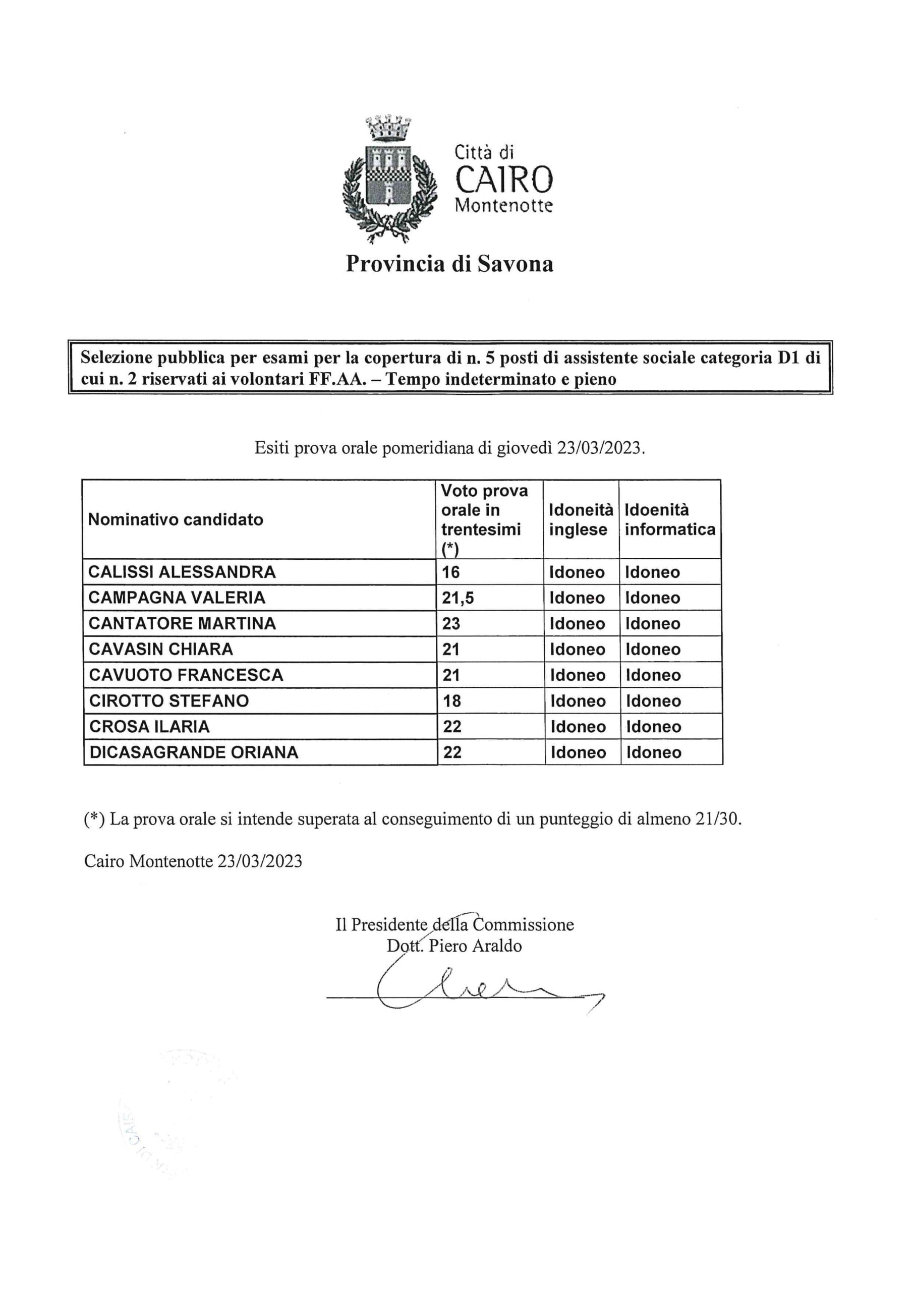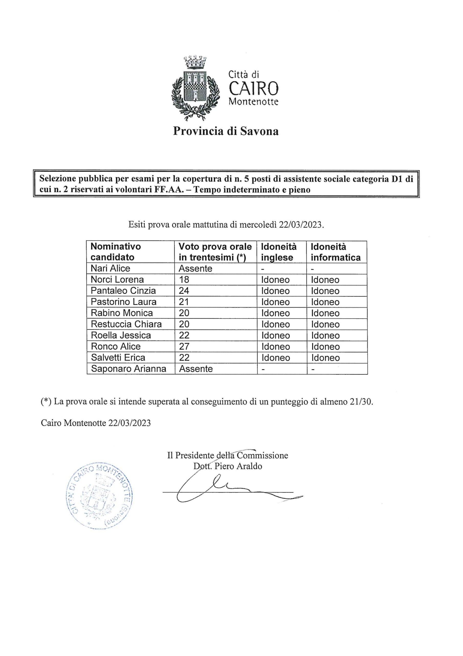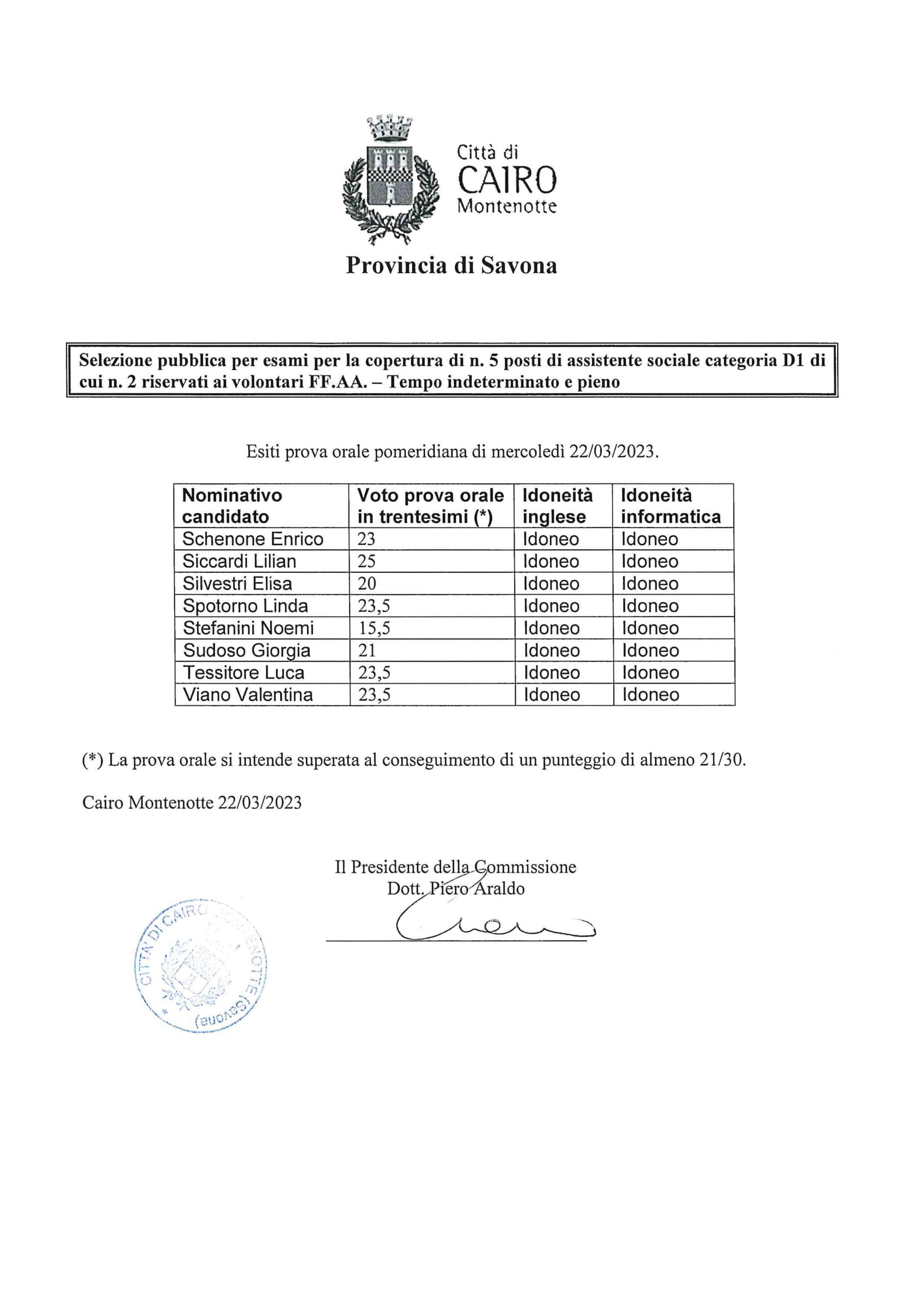 ESITI PROVA ORALE POMERIDIANA DI MERCOLEDI' 22/03/2023