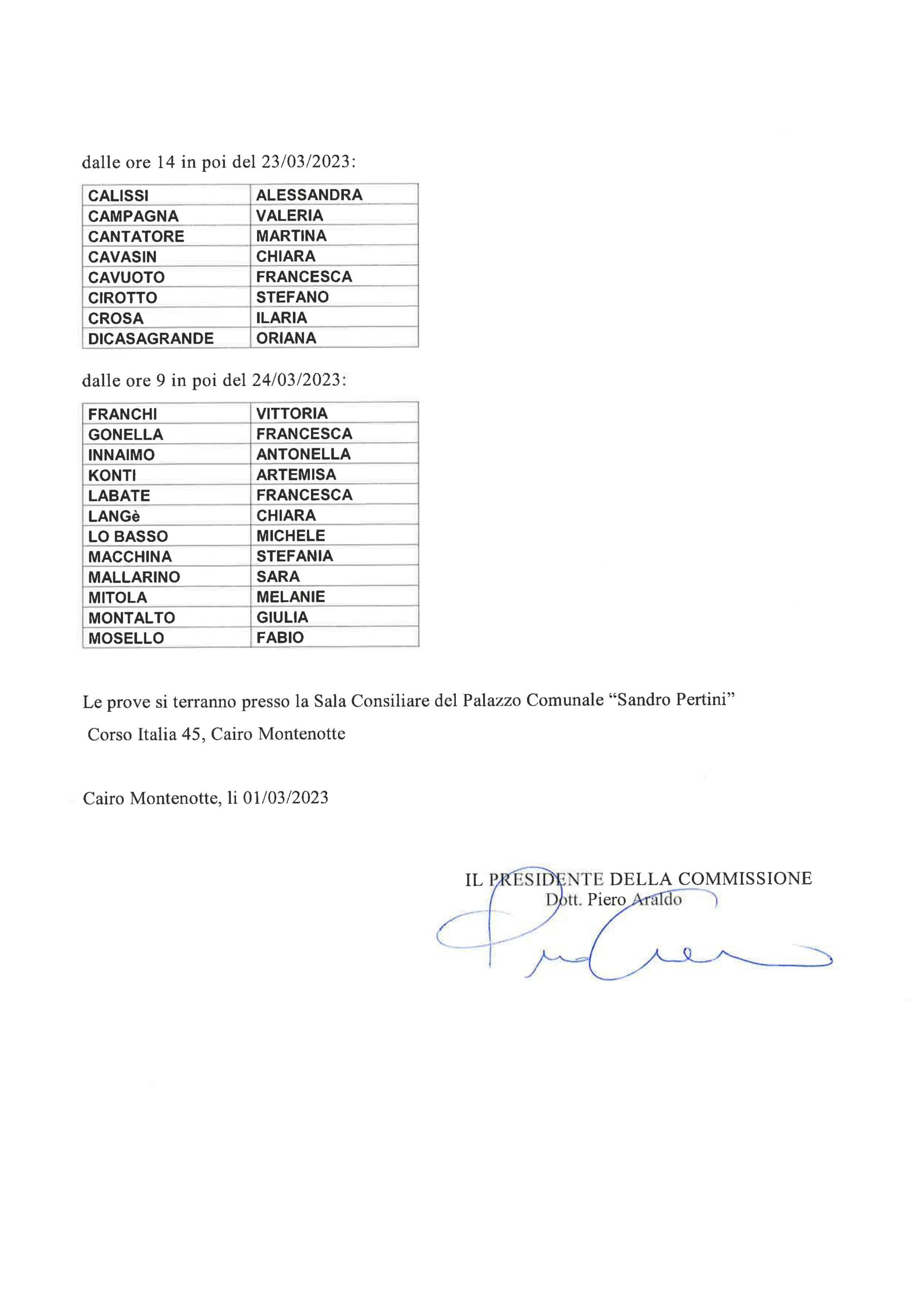 SI AVVISA CHE- LE PROVE ORALI SI TERRANNO NEL TEATRO COMUNALE OSVALDO CHEBELLO situato in Cairo Montenotte — Piazza della Vittoria secondo il calendario pubblicato con precedente avviso