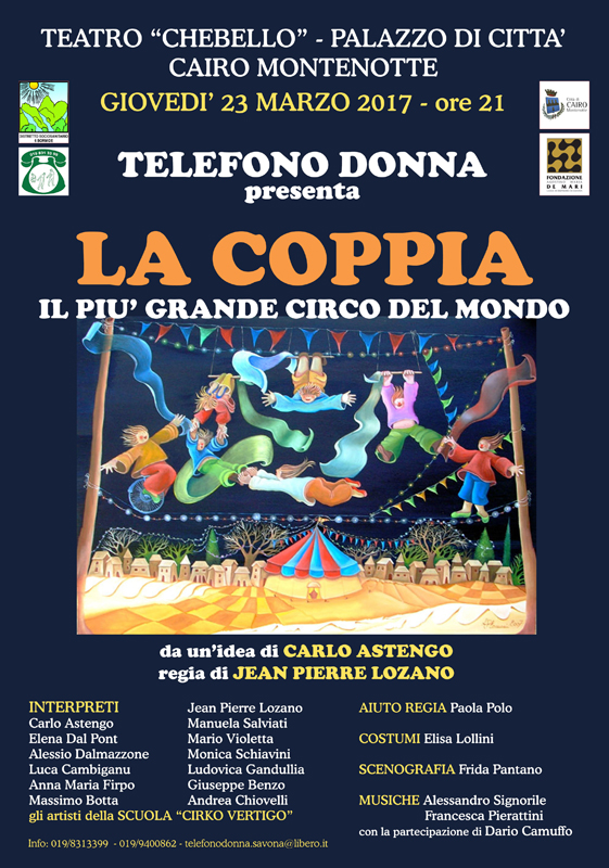 Giovedì 23 marzo alle ore 21,00 al Teatro Comunale “Chebello” di Cairo Montenotte l’Associazione Telefono Donna presenta lo spettacolo “La coppia – il più grande circo del mondo”, dedicato alla drammatica tematica della violenza di genere.