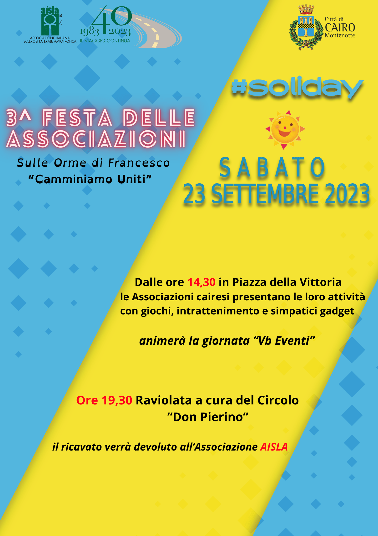 L’Amministrazione Comunale organizza la 3^ Festa delle Associazioni, #soliday, in programma sabato 23 settembre, in Piazza della Vittoria, a partire dalle ore 14,30. L'evento ricade all'interno delle iniziative previste dal progetto "Sulle orme di Francesco, Camminiamo Uniti". Nel pomeriggio le Associazioni partecipanti avranno la possibilità di illustrare ai visitatori le loro attività, proponendo prove sul campo e dimostrazioni all’insegna di un coinvolgimento divertente, finalizzato a stimolare nuove passioni ed eventualmente nuove adesioni. In particolare a bambini e ragazzi è rivolta l’attenzione dei vari sodalizi, nella speranza di suscitare interesse e nella consapevolezza di svolgere un’azione di indubbia utilità promuovendo valori quali solidarietà, volontariato, partecipazione sociale.
