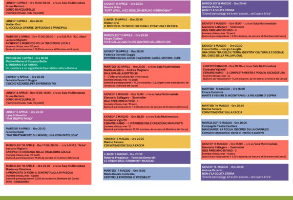 IIniziano i Corsi della seconda sessione di “NutriMente – Condividiamo la conoscenza” Edizione 2019. Anche i Corsi di questa sessione sono raggruppati in sei grandi aree tematiche: Musica e Arte, Praticamente, che propone cinque corsi a numero chiuso dedicati a “Antipasti e Merende nella tradizione locale”, “I centrotavola di Pasqua”, “Dall’uva alla bottiglia”, “Oggi parliamo di vino” e “Ceramichiamo”, Salute e Ambiente, Storia e Letteratura, Territorio e Tradizioni. Il Calendario