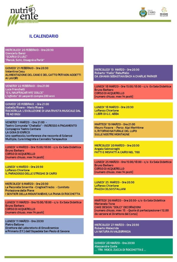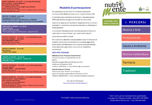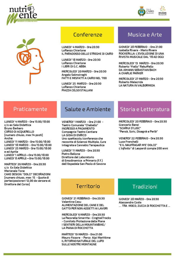 Riprende, anche nel 2019, il progetto di valorizzazione e condivisione culturale “NutriMente – Condividiamo la conoscenza – Università di Cairo per tutti” che rappresenta un innovativo modello di formazione permanente rivolto a tutte le età. Nel corso degli anni, il progetto culturale, ha saputo evolversi andando incontro alle esigenze più attuali, nell’ottica di presentare sempre più significative proposte. Come la scorsa edizione, anche l’attuale, è suddivisa in due sessioni, la prima delle quali prenderà inizio il prossimo 20 febbraio e si concluderà a marzo. Da aprile a maggio, si svolgeranno i corsi della seconda sessione. I Corsi di questa edizione sono raggruppati in sette grandi aree tematiche: Conferenze, Musica e Arte, Praticamente, Salute e Ambiente, Storia e Letteratura, Territorio e Tradizioni.