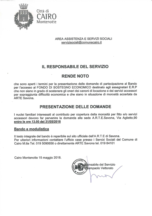 Sono aperti i termini per la presentazione delle domande di partecipazione al Bando per l'accesso al FONDO DI SOSTEGNO ECONOMICO destinato agli assegnatari E.R.P che non siano in grado di sostenere gli oneri dei canoni di locazione e dei servizi accessori per sopraggiunta difficoltà economica e che siano in situazione di morosità accertata da ARTE Savona.
