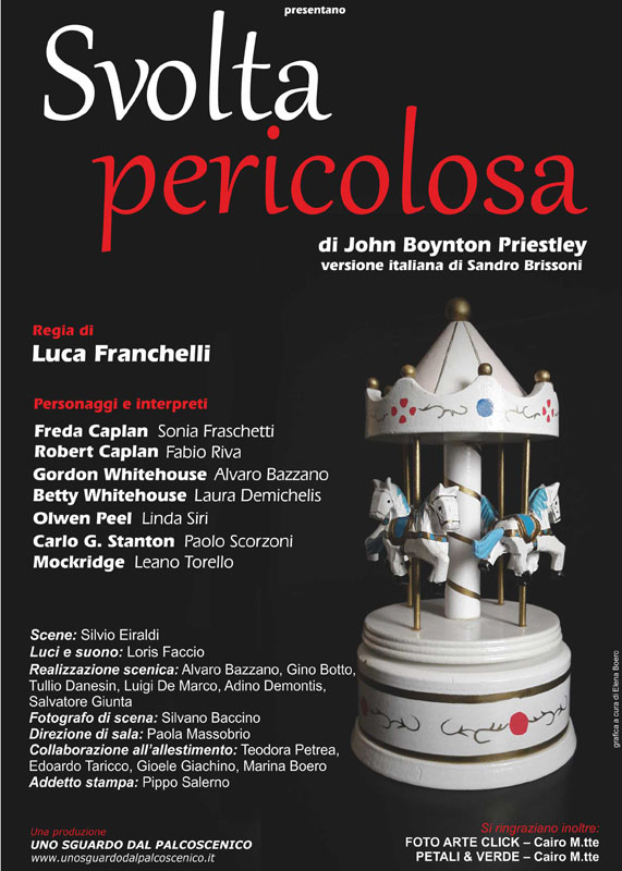 Venerdì 7, Sabato 8 e Domenica 9 aprile alle ore 21 la Compagnia teatrale cairese "Uno sguardo dal palcoscenico", porta in scena "Svolta pericolosa" del drammaturgo inglese Priestley. Luca Franchelli dirige gli attori in una piéce organizzata in una partitura di tre atti senza soluzione alcuna di continuità.