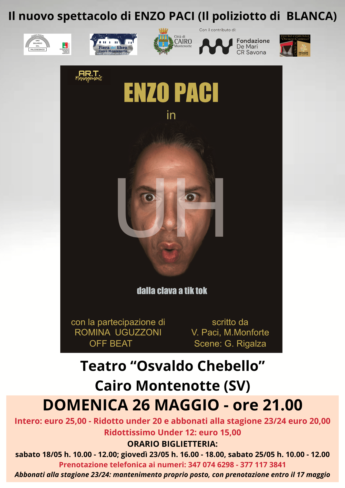 Dopo i successi televisivi di Blanca e Zelig, il comico genovese torna con il suo nuovo spettacolo UH – dalla clava a tik tok con la partecipazione di Romina Uguzzoni. Da sempre incuriosito dalle fragilità umane, Enzo Paci affronta nei suoi monologhi temi in cui mette a nudo vizi e virtù dell’uomo moderno e di se stesso in prima persona, regalando al pubblico maschere tanto impietose quanto esilaranti. “Chi siamo? Da dove veniamo? Dove stiamo andando? Cosa c’è dopo la morte? E prima della nascita? Esiste Dio? Sono solo alcune delle domande che hanno assillato gli esseri umani per millenni! Poi siamo arrivati noi…” Inizia così il nuovo monologo comico di Enzo Paci in cui, ripercorrendo a larghe linee l’evoluzione dell’uomo, cercherà di rispondere alla domanda: Ma siamo sicuri che ci siamo evoluti?
