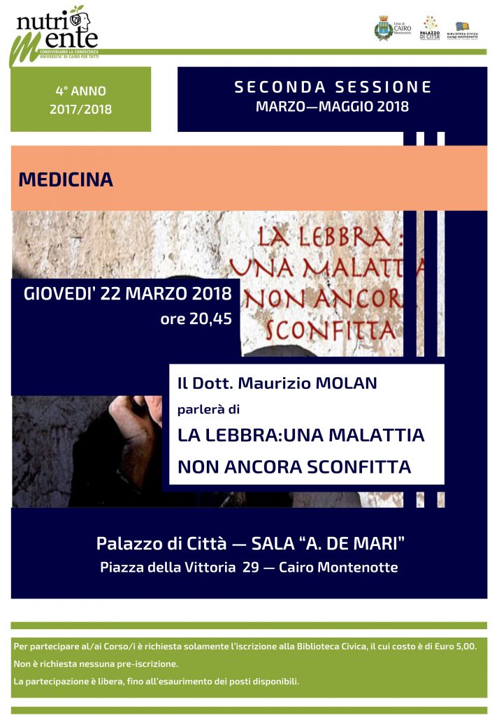 Giovedì 22 marzo, alle ore 20,45 presso la Sala De Mari, nell'ambito del progetto culturale “NutriMente”, il Dott. Maurizio Molan terrà una lezione su "La lebbra: una malattia non ancora sconfitta”, nella quale parlerà delle sue particolarità mediche e biologiche.