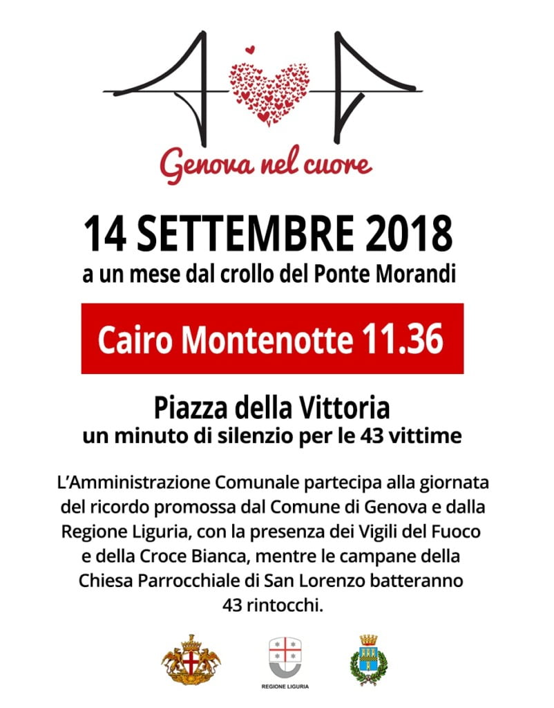A un mese esatto dal crollo del ponte Morandi, alle ore 11,36 in Piazza della Vittoria si terrà un minuto di raccoglimento in memoria delle 43 vittime del crollo del Ponte Morandi, con la presenza dei Vigili del Fuoco e della Croce Bianca, mentre le campane della Chiesa Parrocchiale di San Lorenzo batteranno 43 rintocchi.