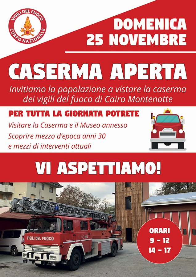 Caserma dei Vigili del Fuoco di Cairo Montenotte aperta alle visite, domenica prossima 25 novembre 2018, dalle ore 9 alle 12 e dalle ore 14 alle 17.