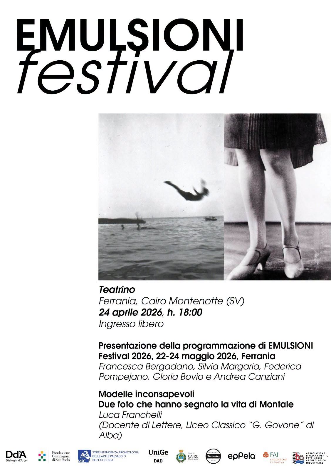 Venerdì 24 aprile alle ore 18:00 presso il Teatrino di Ferrania, con ingresso libero, si svolgerà la presentazione della programmazione di Emulsioni Festival 2026 del 22/24 maggio a Ferrania