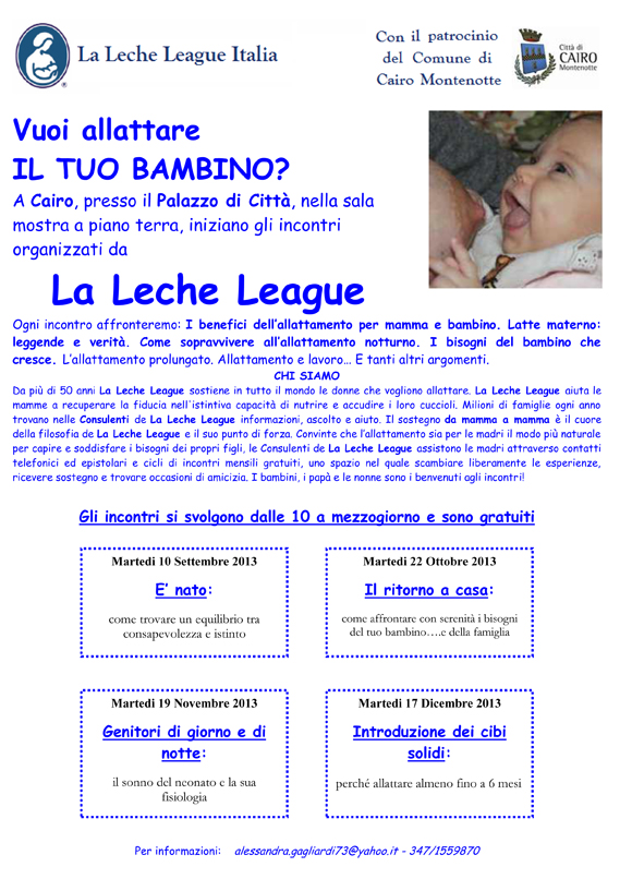 Martedì 10 settembre inizia il nuovo ciclo di incontri dedicati all'allattamento materno organizzati dalla Leche League con il patrocinio dell'Amministrazione, rivolti alle mamme coi loro bambini, ai papà, alle nonne e ai fratellini più grandi, agli operatori del mondo della salute. Durante gli incontri le consulenti volontarie forniranno spiegazioni, sostegno ed incoraggiamento alle mamme che vogliono allattare il proprio bambino, nonché informazioni utili per affrontare al meglio l'allattamento e i primi mesi di maternità, aiutando le mamme a recuperare la fiducia nell'istintiva capacità di nutrire e accudire i propri figli. La partecipazione è agli incontri, che si svolgeranno con cadenza mensile presso il Palazzo di Città, è del tutto gratuita. Il primo appuntamento è per martedì 10 settembre alle ore 10 presso la sala mostre del Palazzo di Città.