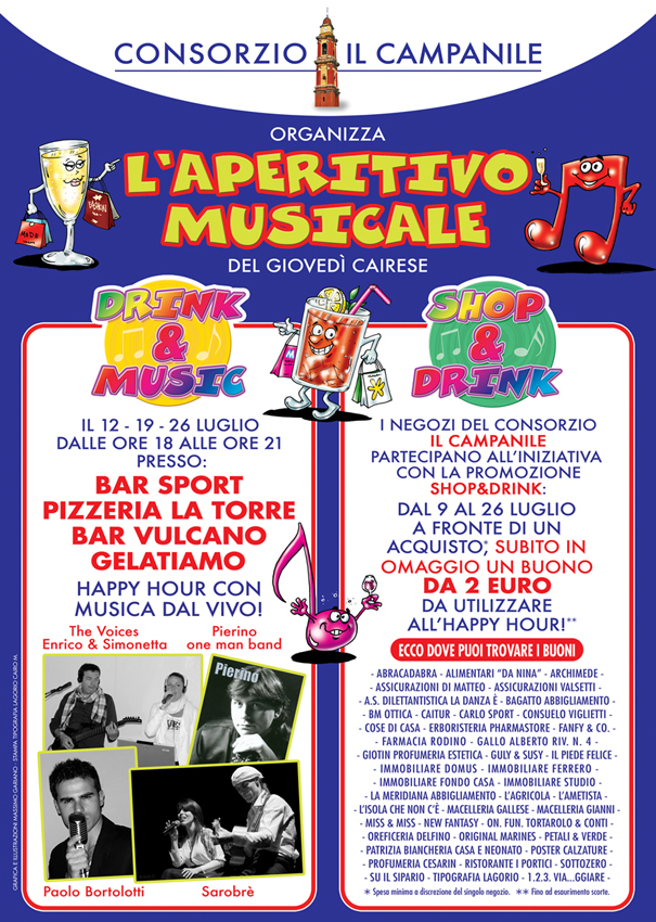 Il Consorzio "Il Campanile", con il patrocinio del Comune di Cairo Montenotte, ha organizzato per il mese di luglio tre serate di musica, il prossimo appuntamento con l'happy hour è per giovedì 19, e poi ancora per giovedì 26 luglio, ed in più tutti i negozi del consorzio partecipano con l'iniziativa Shop&Drink, un buono sconto di due euro, non fatevelo scappare!