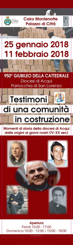 Schema della mostra INTRODUZIONE : Dal Vangelo al Concilio Vaticano II [pan.1] Prima parte: IL FILO DELLA STORIA sez. 1 – dal IV al XI secolo [pan.2-3-4] sez. 2 – da san Guido al XV secolo [pan. 5- 6-7] sez. 3 – dal Concilio di Trento al XVIII sec. [pan. 8-9-10] sez. 4 – L’età contemporanea (XIX-XX secolo) [pan. 11-12-13-14-15] Seconda parte: TESTIMONI DELLA FEDE in diocesi - unica e universale chiamata alla santità (LG 40) - il mistero dell’uomo e la speranza cristiana (GS. 22) sez. 1 – Santi, beati, venerabili, servi di Dio della diocesi [pan. 16-17-18-19-20] (in ordine cronologico da s.Maggiorino a Chiara Badano) - santi e parrocchie in diocesi sez.2 – Testimoni segnalati da comunità e associazioni [pan.-21-22]     "Testimoni di una comunità in costruzione" Mostra sulla Diocesi di Acqui e i suoi Santi Sala Esposizioni di Palazzo di Città - Cairo Montenotte da giovedì 25 gennaio a domenica 11 febbraio 2018 Orario: Giorni feriali dalle ore 15 alle ore 17 Giorni festivi dalle ore 10 alle ore 12 e dalle ore 15 alle ore 18