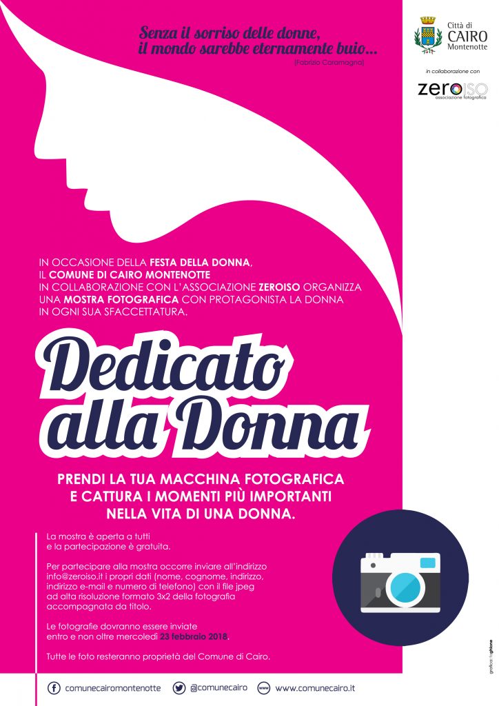 In occasione della Festa della Donna, il Comune di Cairo Montenotte, in collaborazione con l’Associazione "ZeroIso”, organizza una Mostra Fotografica con protagonista la donna in ogni sua sfaccettatura, aperta a tutti e a partecipazione gratuita.