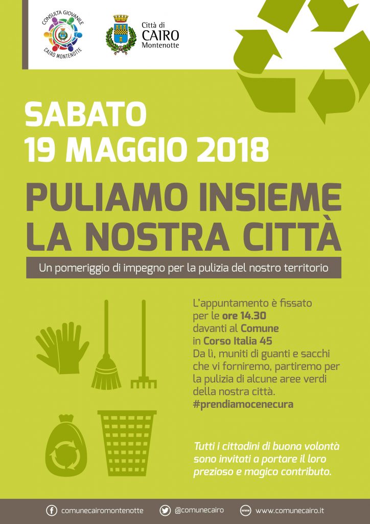 Tutti i cittadini di buona volontà potranno impegnarsi, nel pomeriggio di sabato 19 maggio 2018, nella pulizia di alcune aree verdi di Cairo Montenotte. L'iniziativa è promossa dall'Amministrazione e dalla Consulta Giovanile. L'appuntamento è alle ore 14,30 presso il Comune. #prendiamocenecura