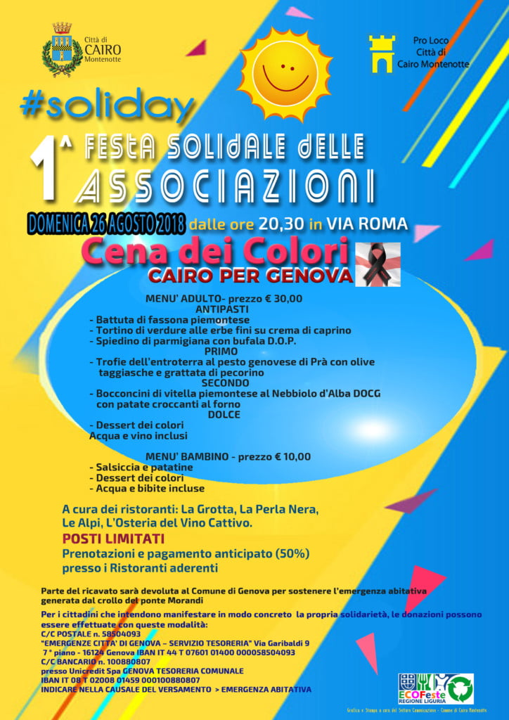 La Cena dei Colori vuole inoltre sottolineare la vicinanza della nostra Città a Genova in un momento così difficile e drammatico per il capoluogo. "Cairo per Genova" è l'ufficializzazione di un impegno concreto di solidarietà finalizzato ad aiutare le molte persone rimaste coinvolte nell'emergenza abitativa generata dal crollo del ponte Morandi. Il ricavato della serata, al netto delle spese, sarà infatti devoluto a questo scopo.