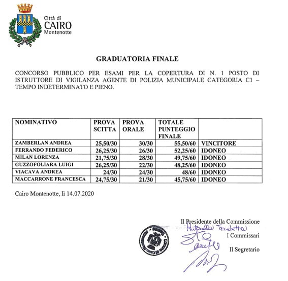 La prova orale del concorso è stata fissata per il giorno martedì 14 luglio 2020 alle ore 15:00 presso il Comune di Cairo Montenotte, Corso Italia 45. Leggi l’avviso di convocazione I candidati dovranno presentarsi muniti di un documento di riconoscimento in corso di validità per le procedure di identificazione. In ottemperanza alla normativa emergenziale Covid-19 i locali saranno sanificati e i candidati dovranno presentarsi muniti di mascherina. Gli stessi sono invitati a compilare il modello di autodichiarazione concernente l'assenza di sintomi Covid-19 disponibile qui: AUTODICHIARAZIONE (formato word) AUTODICHIARAZIONE (formato pdf) Sezione pubblicata in data 22/06/2020 [fusion_builder_container hundred_percent="no" hundred_percent_height="no" hundred_percent_height_scroll="no" hundred_percent_height_center_content="yes" equal_height_columns="no" menu_anchor="" hide_on_mobile="small-visibility,medium-visibility,large-visibility" class="" id="" background_color="" background_image="" background_position="center center" background_repeat="no-repeat" fade="no" background_parallax="none" enable_mobile="no" parallax_speed="0.3" video_mp4="" video_webm="" video_ogv="" video_url="" video_aspect_ratio="16:9" video_loop="yes" video_mute="yes" video_preview_image="" border_size="" border_color="" border_style="solid" margin_top="" margin_bottom="" padding_top="" padding_right="" padding_bottom="" padding_left="" admin_toggled="no"][fusion_builder_row][fusion_builder_column type="1_1" layout="1_1" spacing="" center_content="no" link="" target="_self" min_height="" hide_on_mobile="small-visibility,medium-visibility,large-visibility" class="" id="" background_color="" background_image="" background_position="left top" background_repeat="no-repeat" hover_type="none" border_size="0" border_color="" border_style="solid" border_position="all" padding_top="" padding_right="" padding_bottom="" padding_left="" dimension_margin="" animation_type="" animation_direction="left" animation_speed="0.3" animation_offset="" last="no"][fusion_separator style_type="shadow" hide_on_mobile="small-visibility,medium-visibility,large-visibility" class="" id="" sep_color="" top_margin="" bottom_margin="" border_size="" icon="" icon_circle="" icon_circle_color="" width="" alignment="center" /][/fusion_builder_column][/fusion_builder_row][/fusion_builder_container]GRADUATORIA FINALE