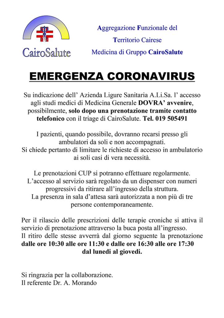 L'ingresso agli studi medici di medicina Generale dovrà avvenire, possibilmente, solo dopo la prenotazione tramite contatto telefonico con Cairo Salute. Tel. 019 505491