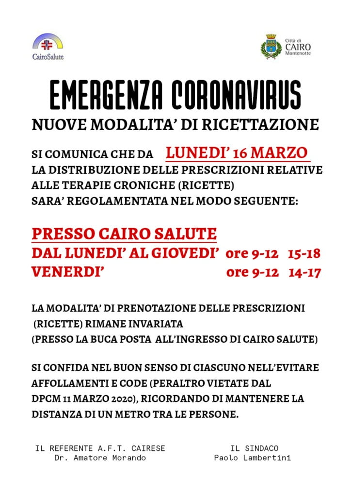 Nuove modalità di consegna delle ricette da parte di Cairo Salute, a partire da lunedì prossimo 16 marzo 2020.