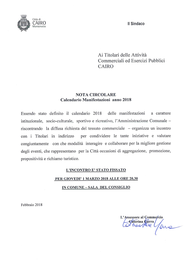 Avendo definito il calendario 2018 delle manifestazioni l'Amministrazione Comunale organizza un incontro con i titolari di attività commerciali ed esercizi pubblici cairesi per presentare le iniziative e valutare insieme con quali modalità collaborare per la migliore gestione di questi eventi che rappresentano per la Città un'importante occasione di aggregazione e promozione turistica.