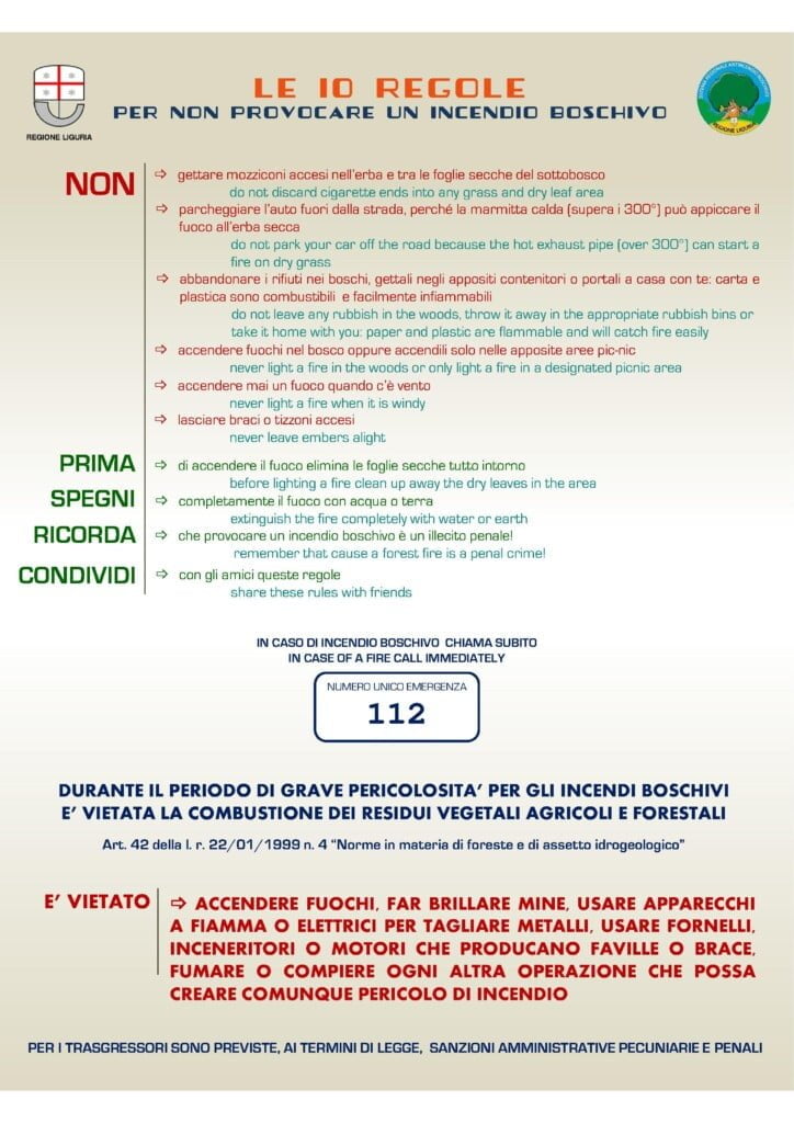 Da sabato 27 luglio 2024 scatta lo stato di grave pericolosità per incendi boschivi su tutto il territorio della Regione Liguria: a causa delle condizioni climatiche e della particolare secchezza del terreno e della vegetazione è vietato accendere qualsiasi tipo di fuoco e usare attrezzature che possano provocare scintille. La Regione Liguria comunicherà la cessazione dello stato di grave pericolosità non appena le condizioni meteo lo consentiranno cioè con l’aumento dell’umidità della vegetazione. In caso di incendio boschivo occorre attivare subito il sistema regionale di intervento chiamando il numero unico di emergenza 112. Leggi/scarica il decreto nr 4926 del 24/07/2024 della Regione Liguria