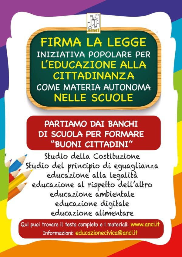 Il Comune di Cairo ha aderito alla campagna dell'Anci (Associazione Nazionale Comuni Italiani) per raccogliere le firma sulla proposta di legge di iniziativa popolare, intitolata “Insegnamento di educazione alla cittadinanza come materia autonoma con voto, nei curricula scolastici di ogni ordine e grado”.